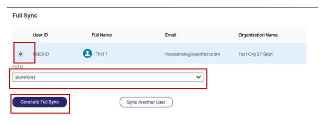 - Select the radio button for the user to be synced. Select the OEM from the drop-down list. Click the Generate Full Sync button.
